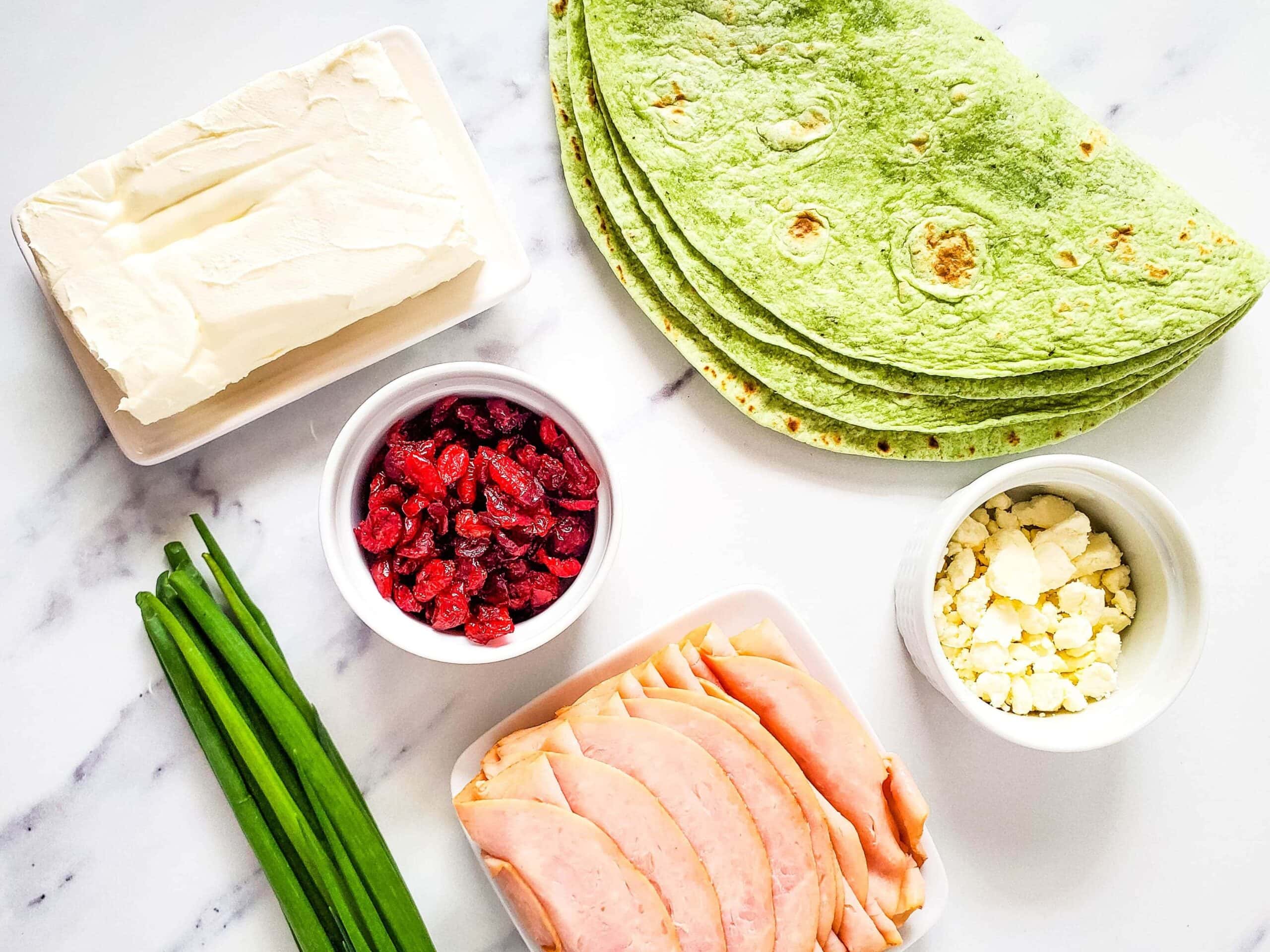 - Spinach wraps add a festive green color, but you can use plain flour tortillas or whole wheat wraps if that’s what you have on hand.